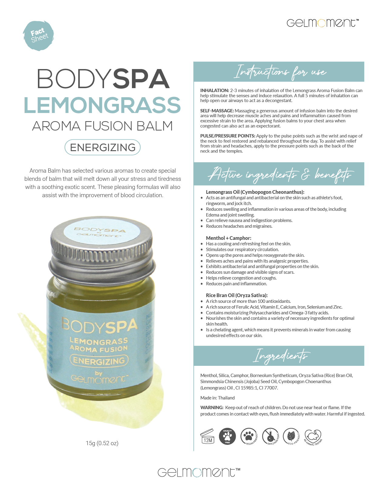 Lemongrass Aroma Balm has selected various aromas to create special blends of balm that will melt down all your stress and tiredness with a soothing exotic scent. These pleasing formulas will also help improve your blood circulation.